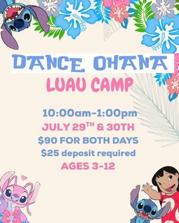 Welcome to Dance Ohana Luau Camp, where “dance ohana” means dance family! Join us for a fun-filled week of tropical vibes, upbeat music, and island-inspired movement. Dancers can come dressed in their favorite beachy attire for Tropical Day and get cozy for a pajama party-style “sleepover” day—complete with bringing their favorite Stitch stuffed animal for extra fun!