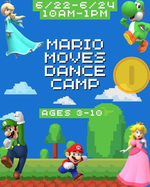 Dancers will jump, spin, and groove their way through upbeat choreography while exploring imaginative, game-inspired challenges. Each day, campers will take on Mario-themed obstacle courses, test their skills, and unlock special “Star Power-Ups” as they level up throughout the week.