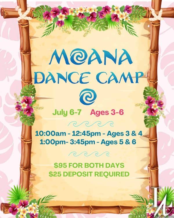 Set sail on a magical journey across the ocean in our Moana-themed dance camp! Designed for ages 3 to 6, this exciting three-day camp will be filled with tropical fun, including island-inspired dancing, creative crafts, and adventurous games. Campers will explore the spirit of Moana through movement, music, and imagination, all while building confidence, friendships, and a love for dance. Each day brings new surprises as we discover the magic of the ocean and the hero within!